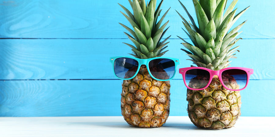 Two pineapples against a bright aqua background wearing plastic sunglasses in blue & pink to imply they are swingers